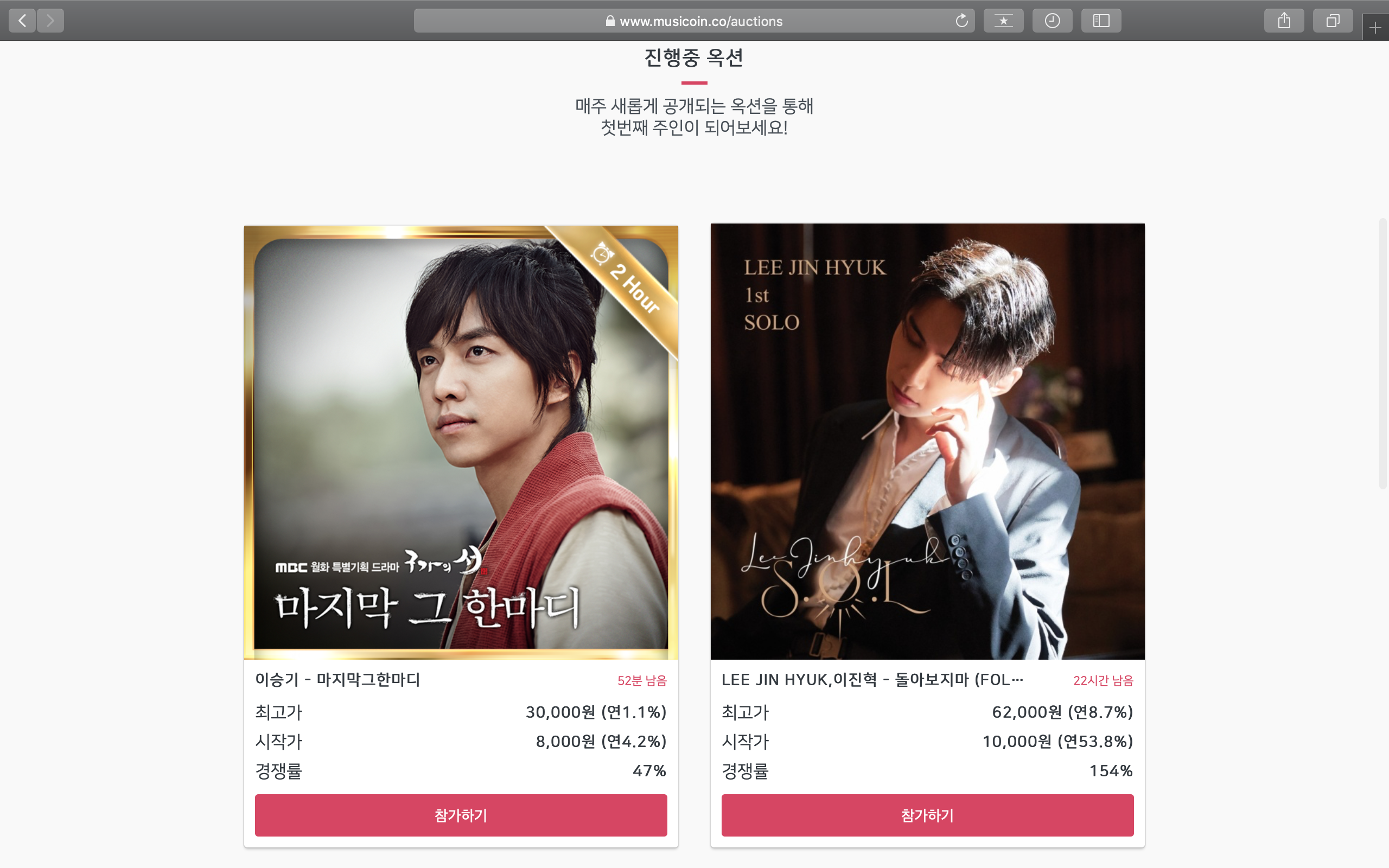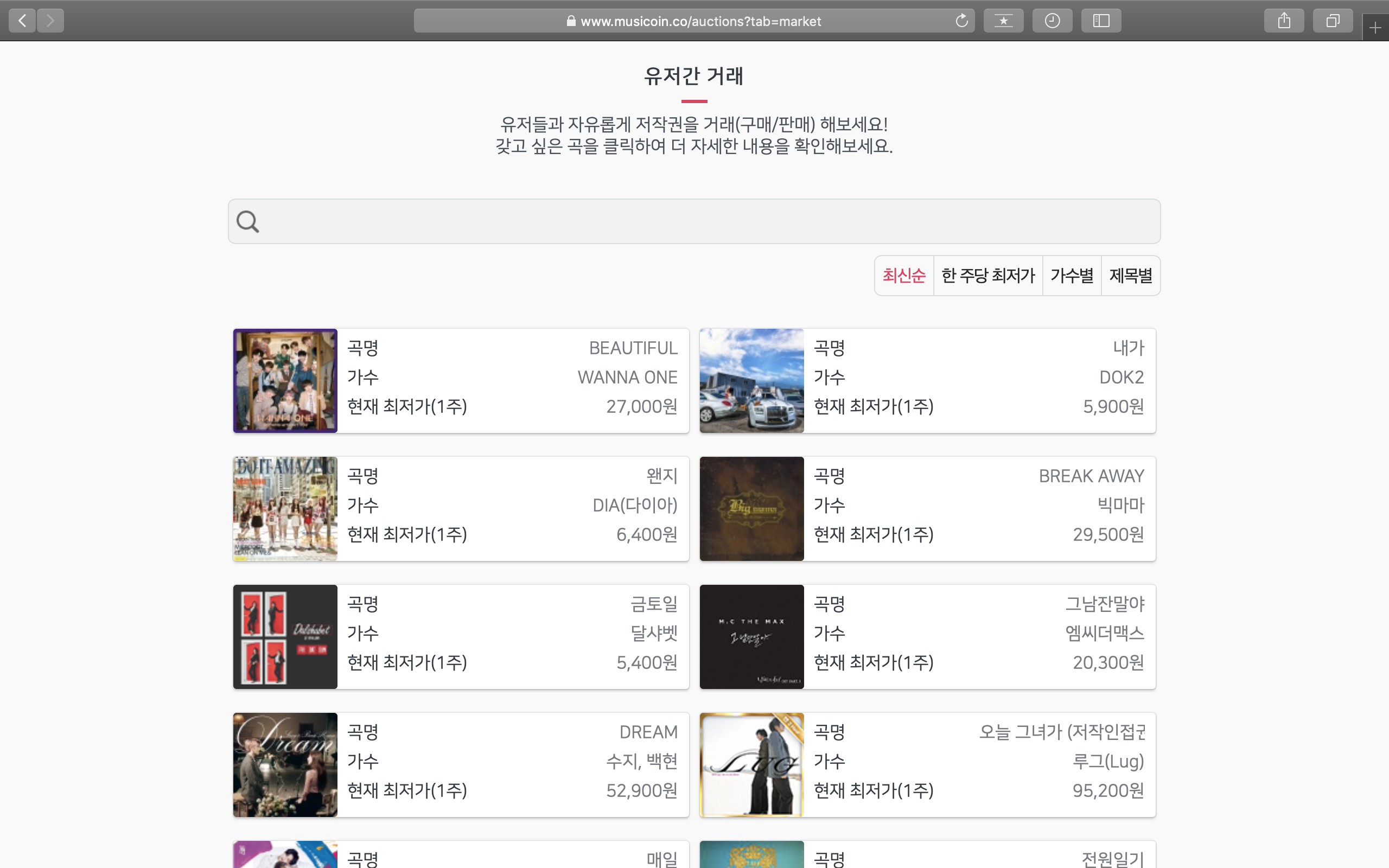 뮤지코인은 크게 '진행중 옥션'과 '유저간 거래'를 통해 음원 저작권을 구입할 수 있는데요.