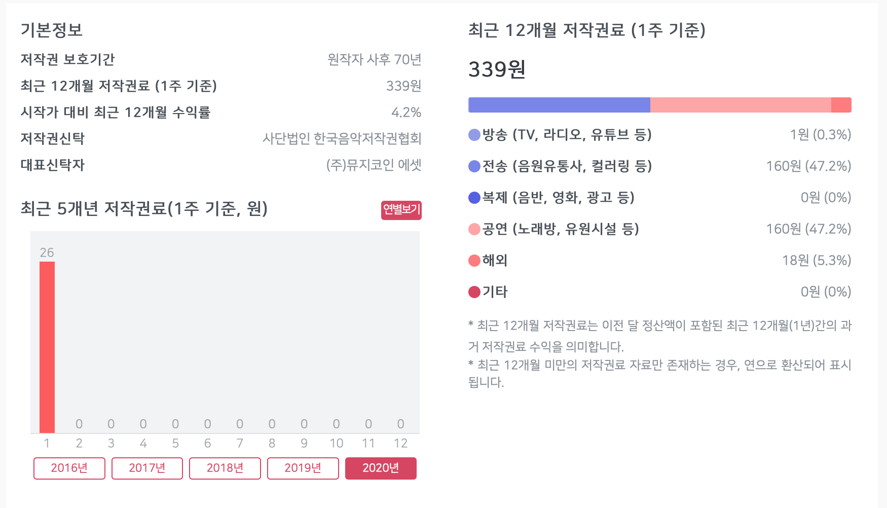 이 정보를 통해 앞으로 얼마나 저작권 수익이 발생할 지 확인하긴 힘들겠지만 조금이나마 예측 할 수 있을 것 같습니다.
