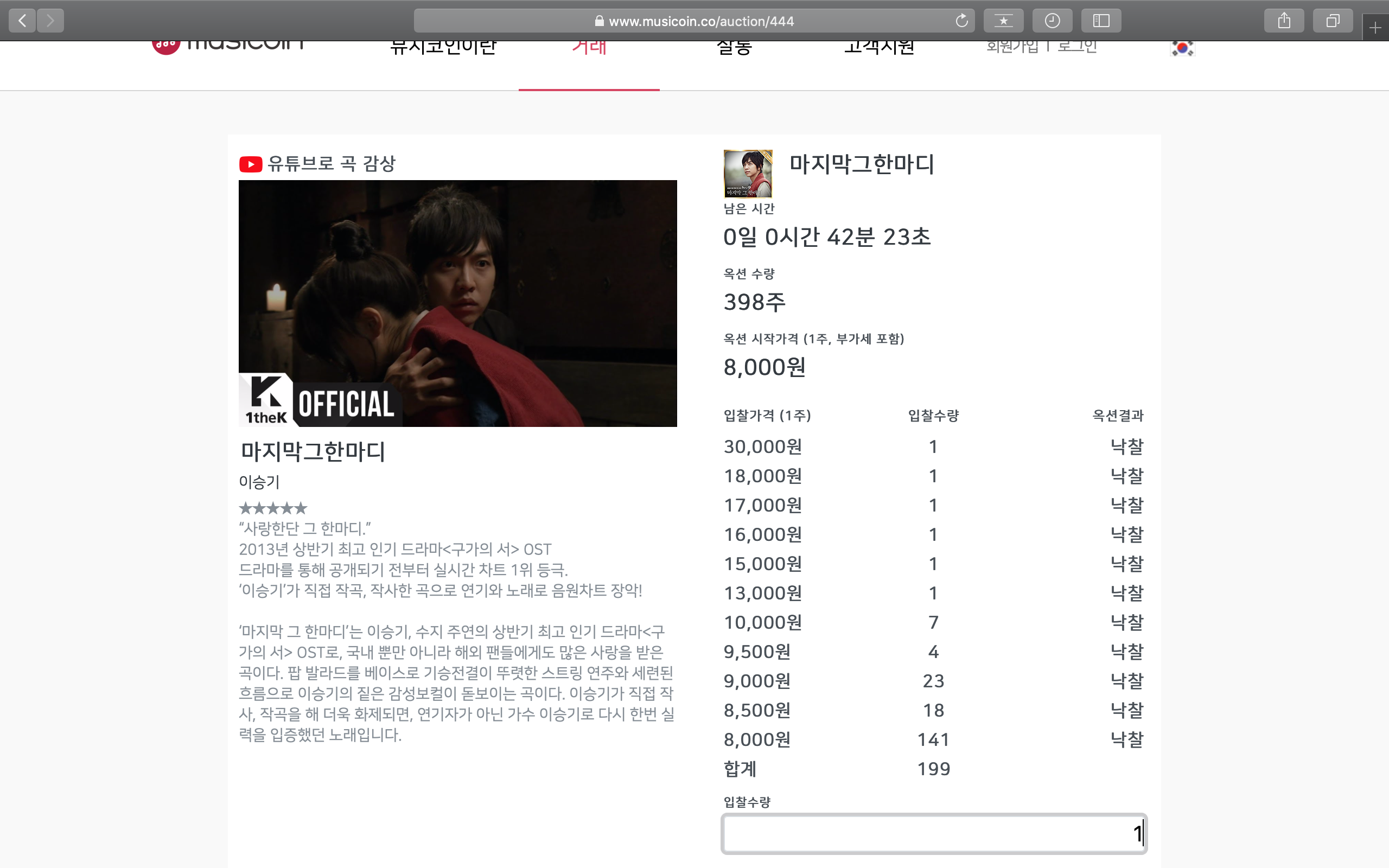 만약 '이승기-마지막 그 한마디'라는 음원 저작권의 경매에 참가할 의사가 있다면 하단의 버튼을 클릭하면 됩니다.