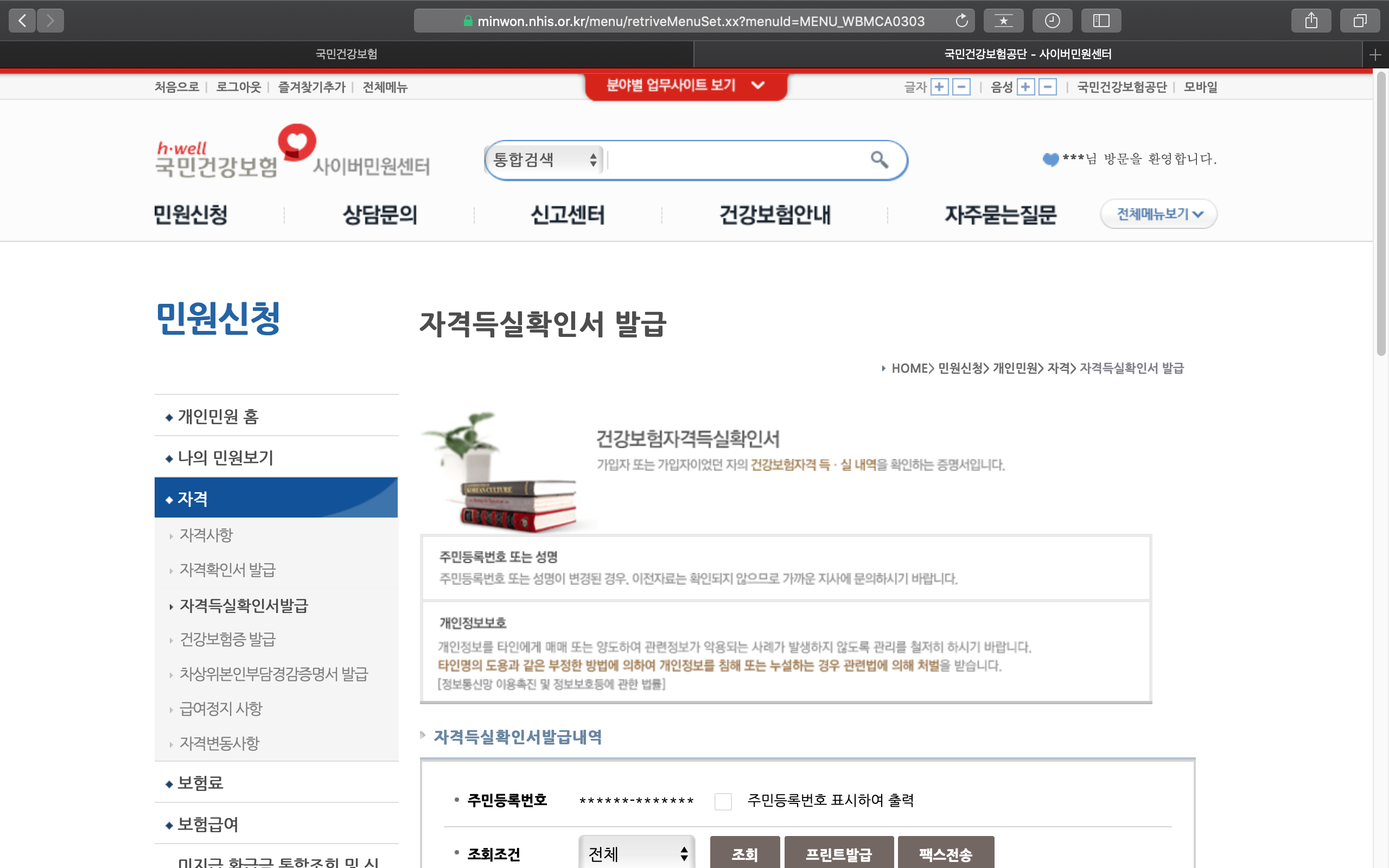 최종적으로 건강보험자격득실확인서를 확인하고 출력할 수 있는 페이지입니다.