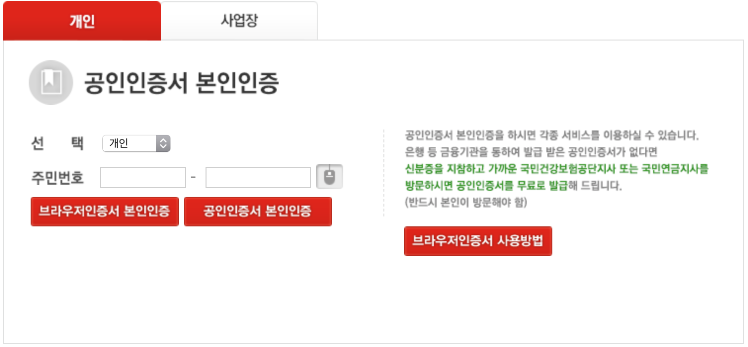 개인정보를 입력하고 공인인증서로 인증한 후 로그인을 합니다.