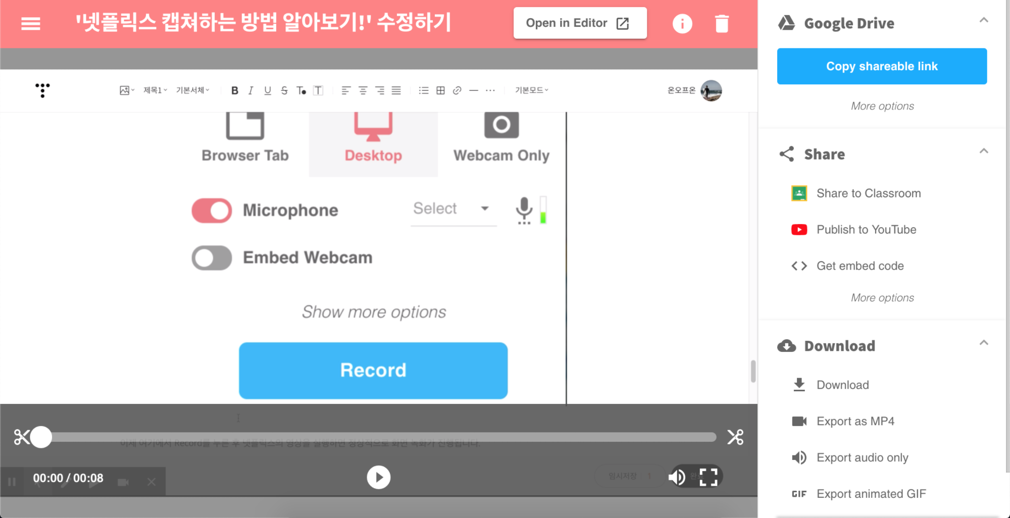 녹화를 마치면 여러가지 기능을 가지고 있는 창이 뜨게 됩니다.