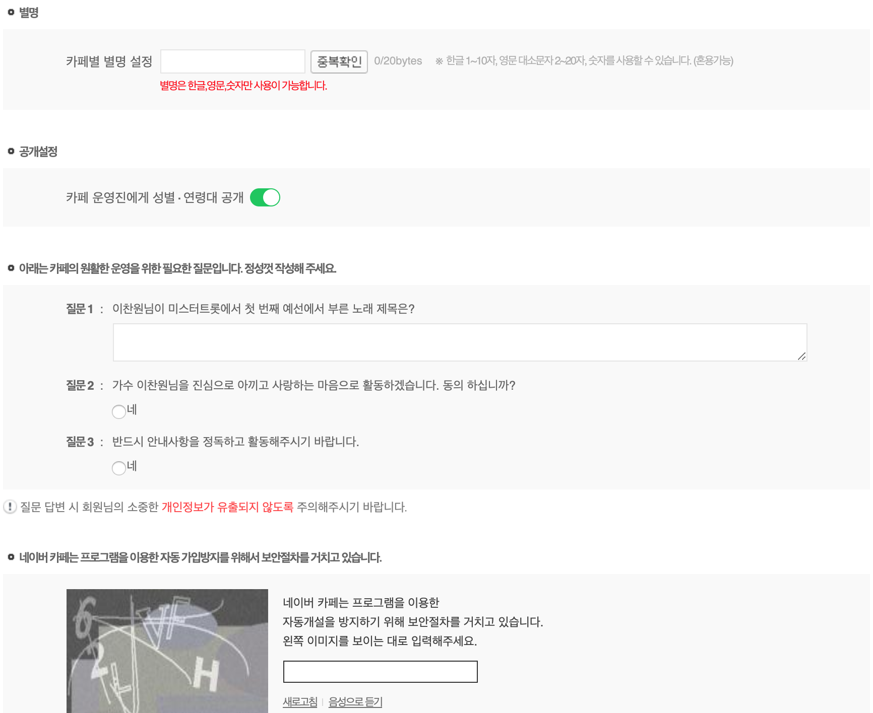 로그인 후 이런 페이지가 열렸다면 카페를 가입하기 위해서 필요한 정보를 입력하시면 됩니다.
