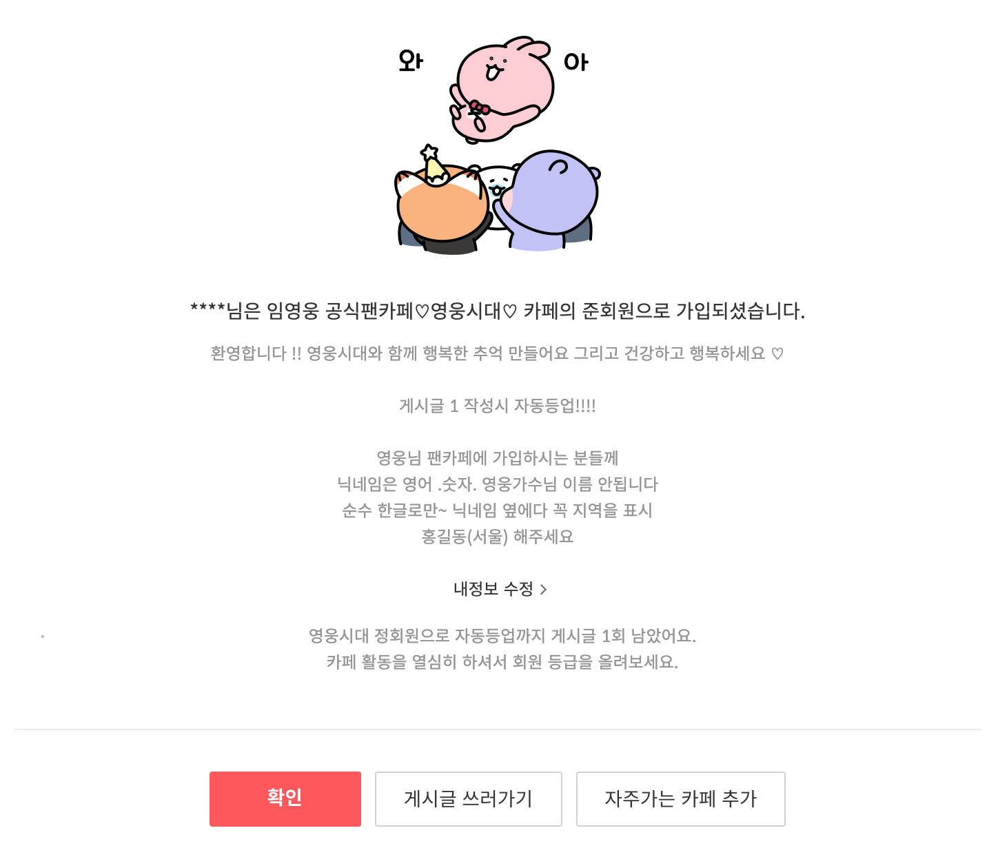 로그인을 완료하시면 위와 같이 카페에 가입하기 위한 몇가지 정보들이 있습니다.