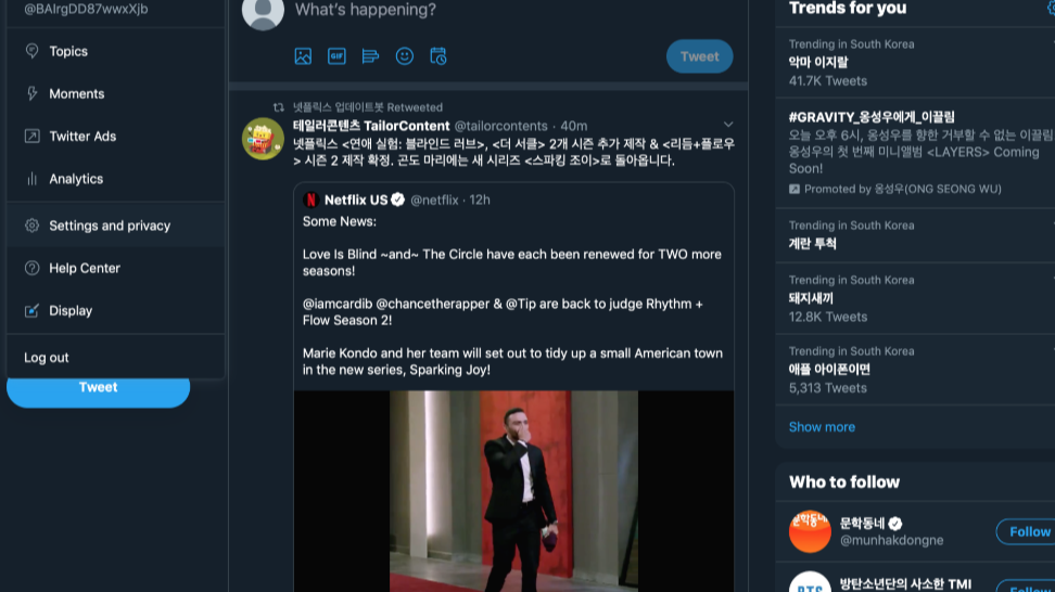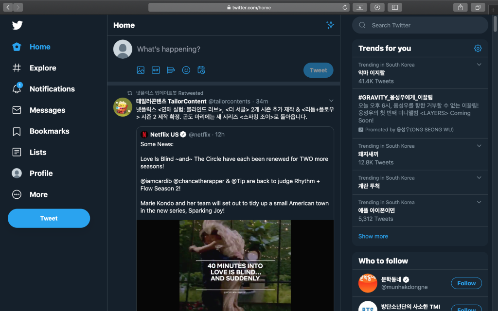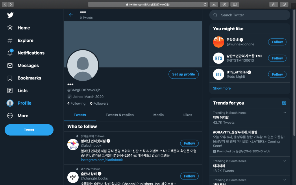 계정 로그인을 완료한 트위터 메인 화면에서부터 시작하겠습니다.