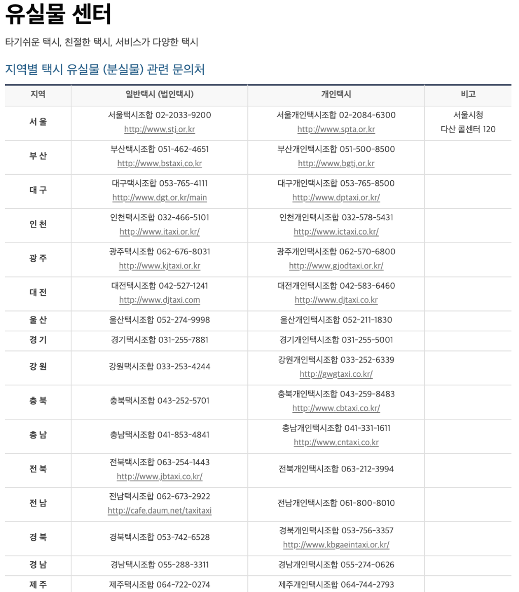 이 페이지에서 각 지역의 대표 유실물센터 번호를 볼 수 있는데요.