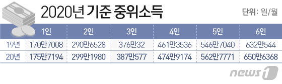 2020년 기준 중위소득 정보를 나타낸 사진입니다.