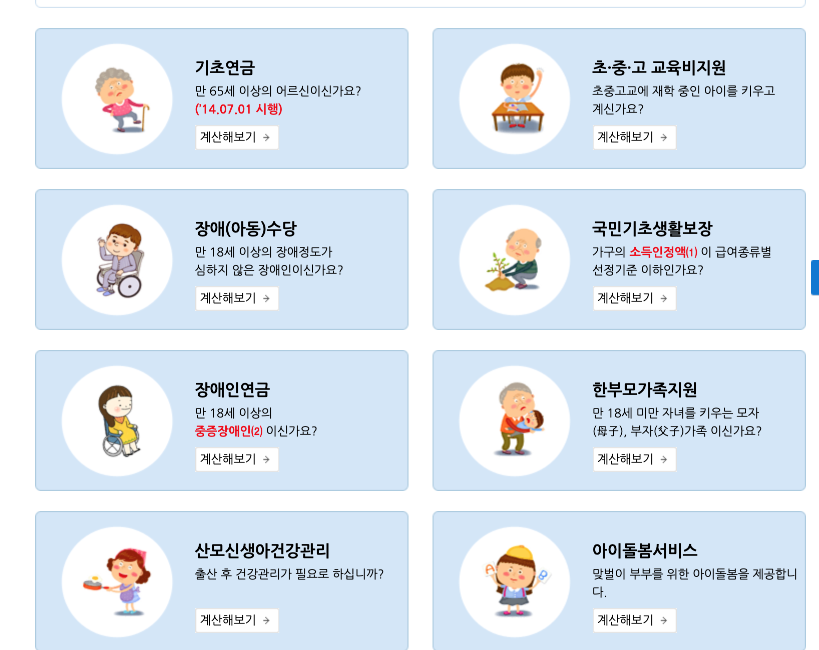 위의 사진을 보시면 다양한 항목의 모의 계산 서비스를 확인할 수 있습니다.