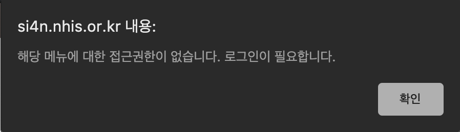 이전 단계에서 보험료 조회/납부 버튼을 클릭하면 위와 같이 로그인을 해야한다는 알람창이 나타납니다.