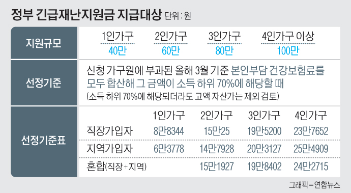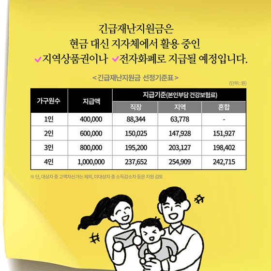 ※ 정부에서 발표한 긴급재난지원금 선정 기준은 다음과 같습니다.(지역상품권과 전자화폐 등으로 지급)