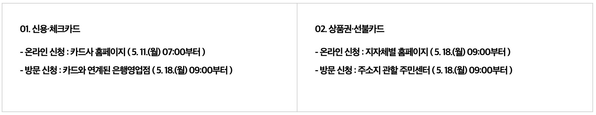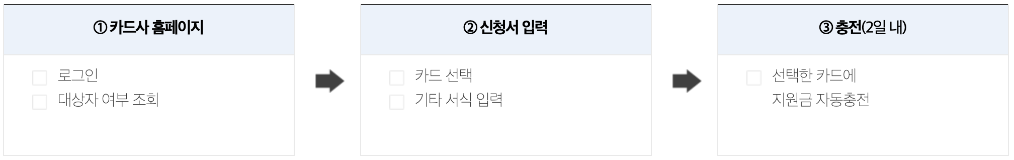 카드사 홈페이지 접속 후 대상자 조회 및 신청서를 입력한 후 신청할 수 있습니다.