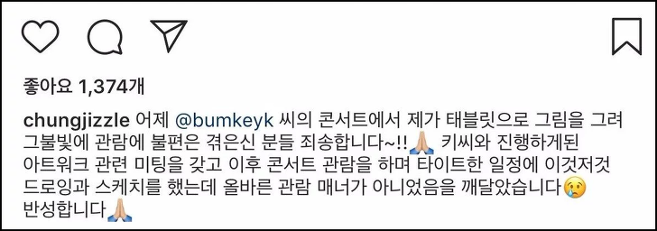 비판을 받고 이모티콘을 삭제하게 되었으며 개인적인 일을 다른 아티스트의 공연장에서 했다는 사실에 대해 많은 분들이 비판하고 있습니다.
