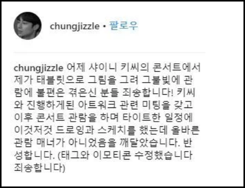 콘서트 'Key Land'에서 2시간 내내 태블릿 겸용 노트북을 들고 그림을 그린 것이 문제가 되었습니다.