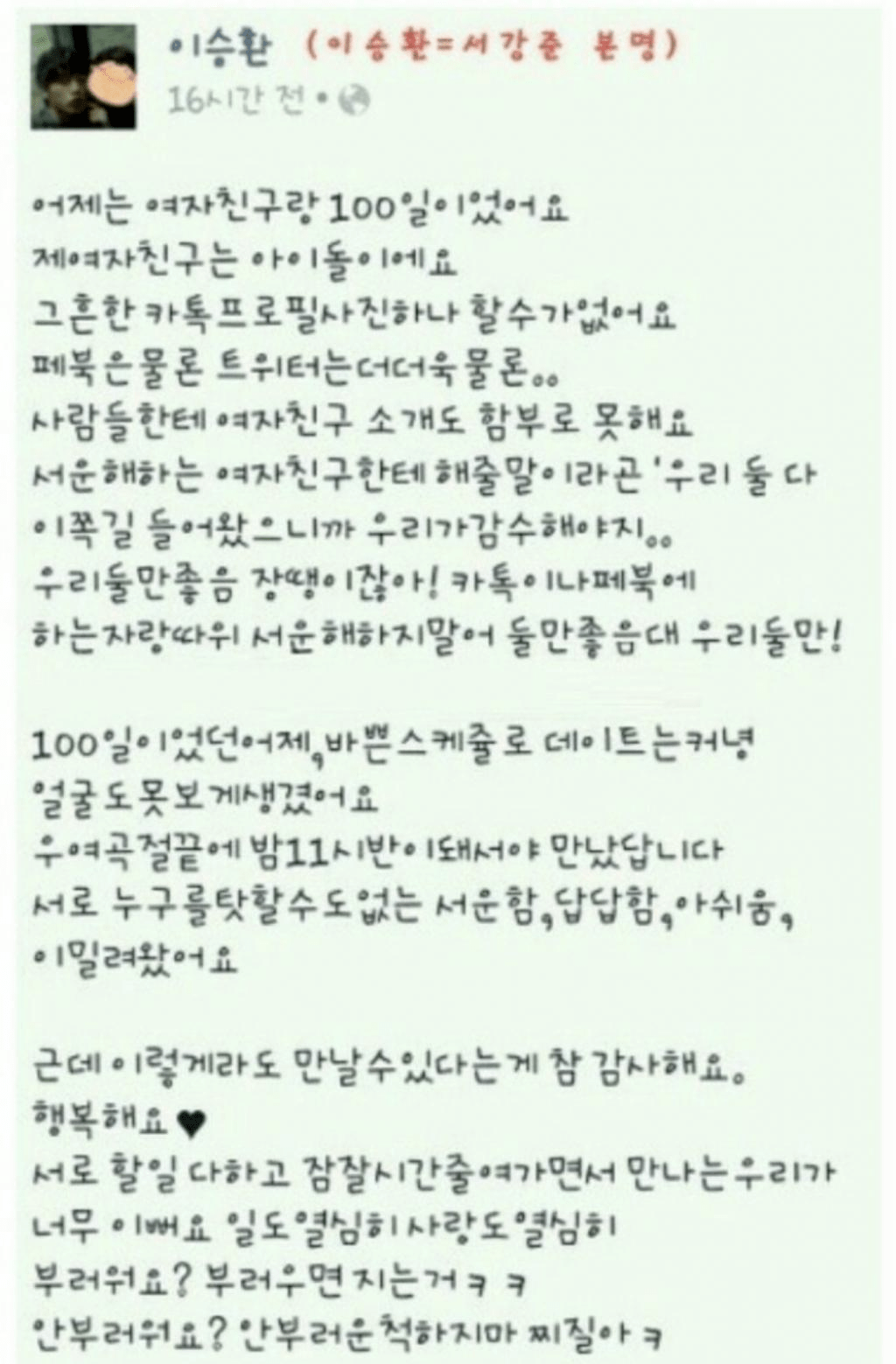 서강준이 온라인에 올린 글은 다음과 같습니다.