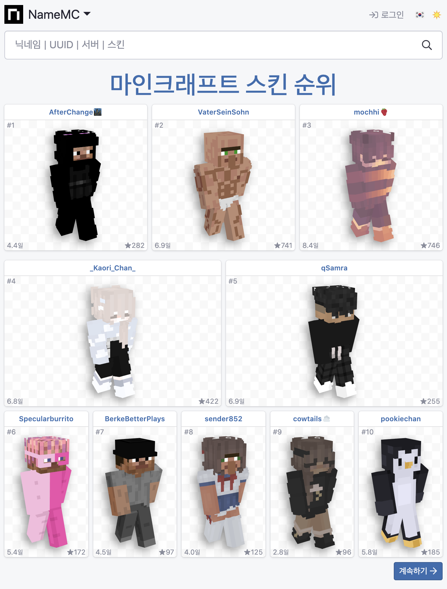 오늘은 마인크래프트 스킨에 대해서 알아보기로 했으니 '마인크래프트 스킨 순위'를 클릭해보겠습니다.