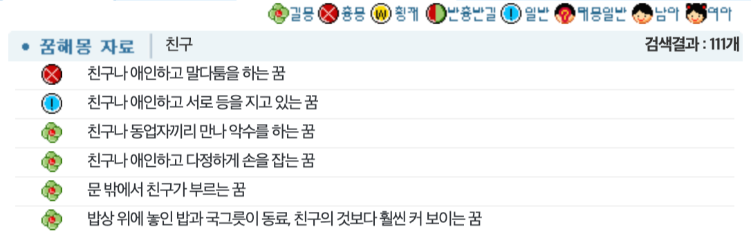위와 같이 친구와 관련된 수많은 꿈해몽이 나오는데요.