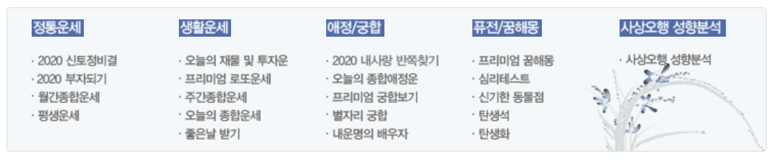 이 곳에서도 꿈해몽 뿐만 아니라 사주, 궁합, 이름 풀이 등 다양한 서비스를 확인할 수 있습니다.