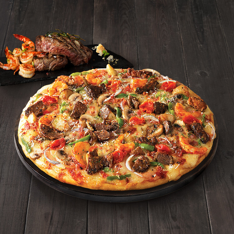 이건 직화 스테이크가 메인으로 들어간 피자입니다.