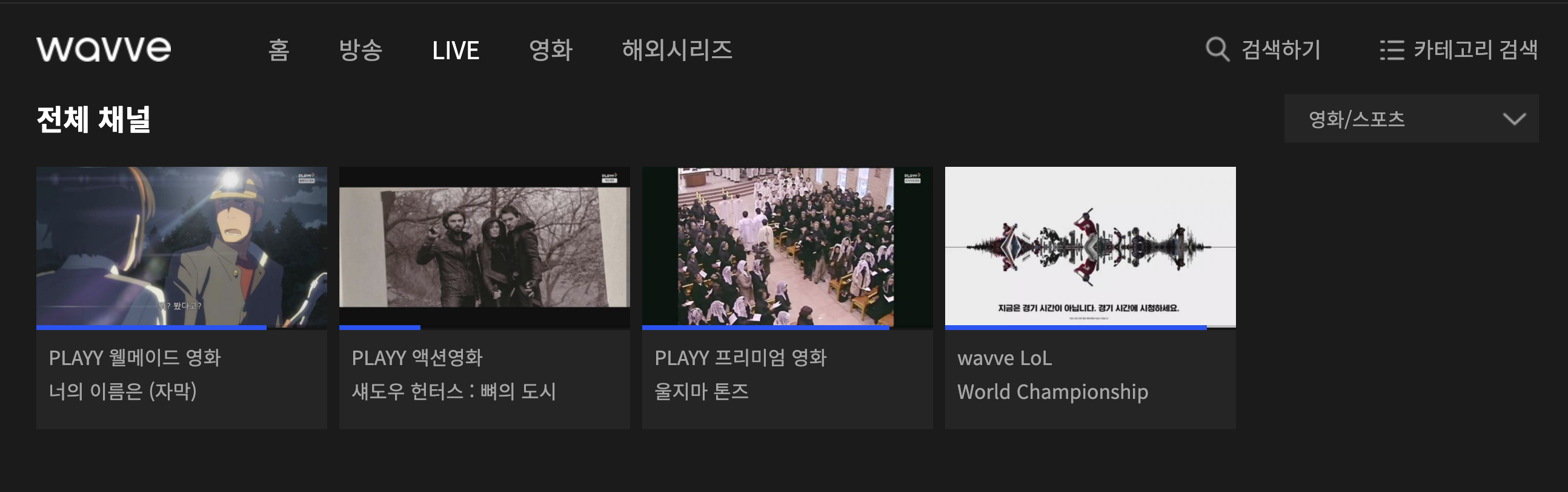 웨이브는 라이브로 영화를 볼 수 있도록 서비스를 제공하고 있습니다.
