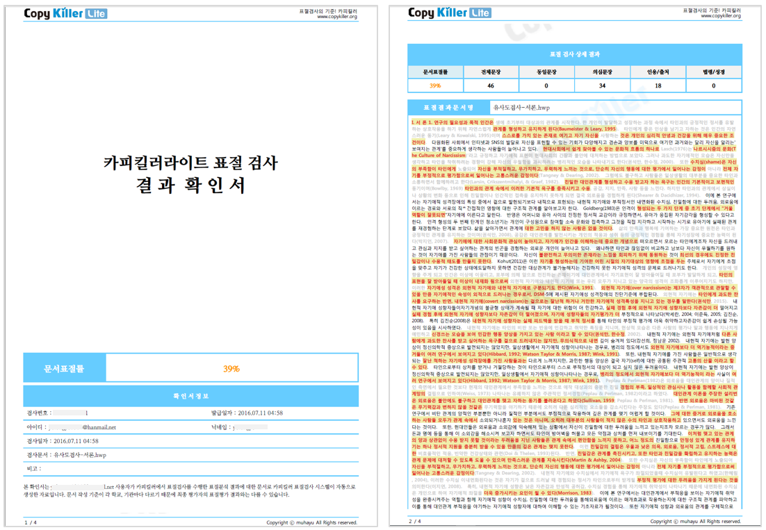 기본 설정으로 표절 검사가 가능하고, 표절 검사시 기본형 표절검사결과확인서가 발급됩니다.