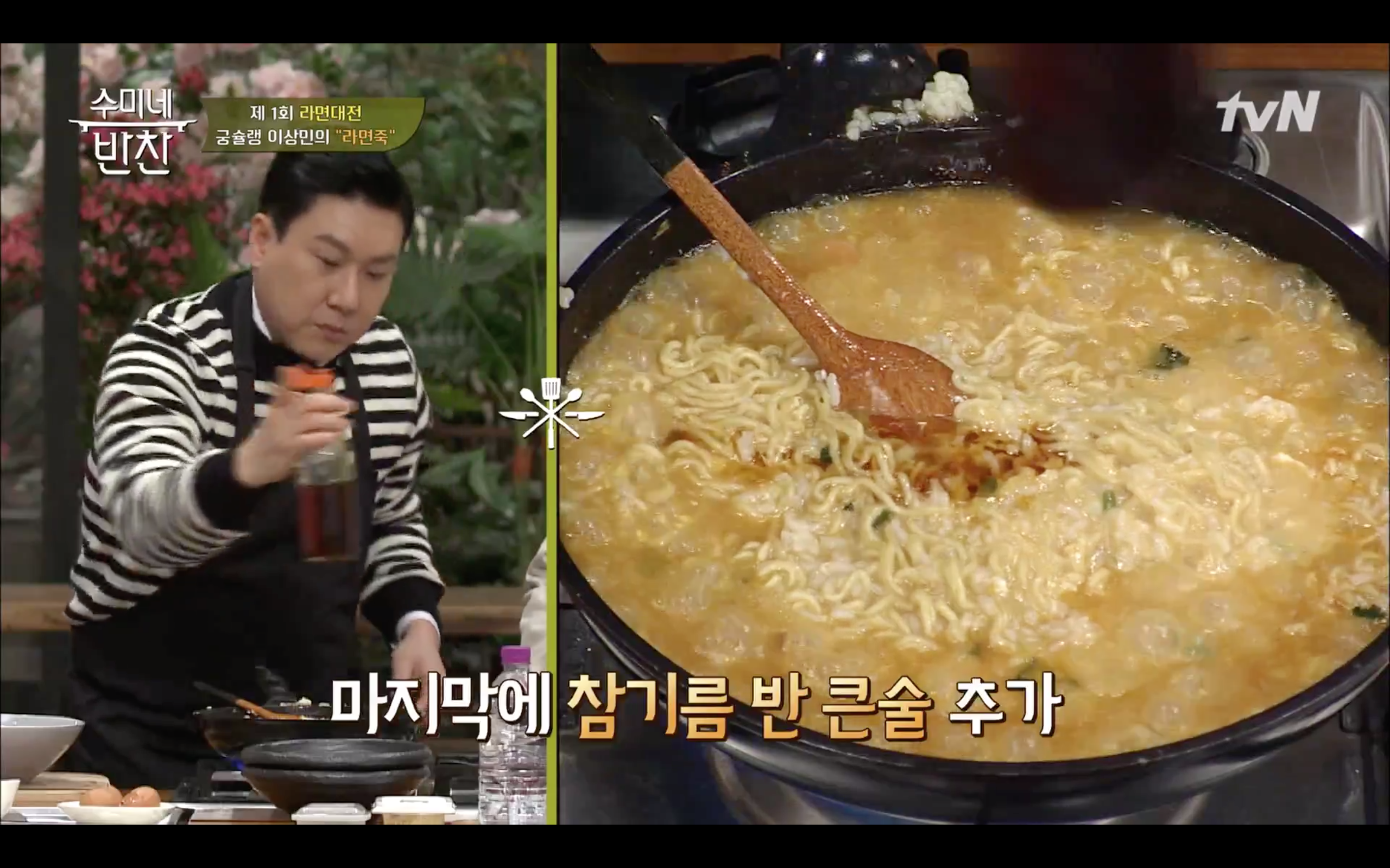 오늘 밤은 연예인 이상민의 라면죽 레시피로 배고픔을 채우려고 하는데요.