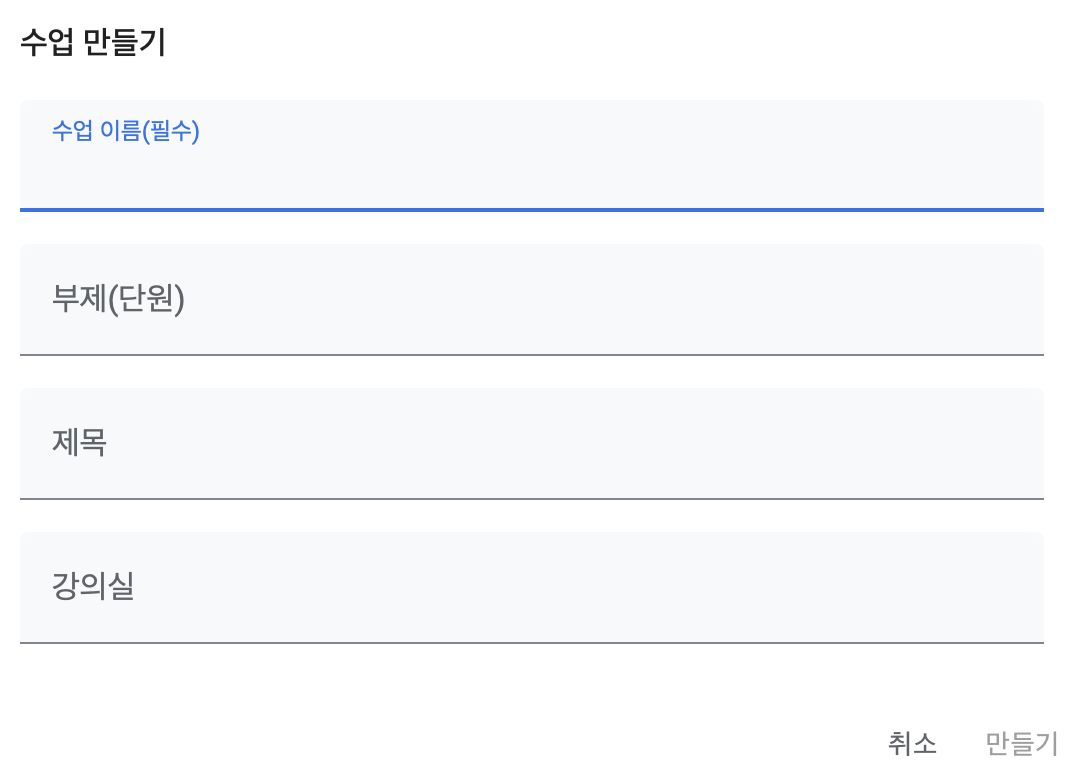 본인이 생각하시는 '수업 이름', '부제(단원)', 제목, 강의실을 입력합니다.