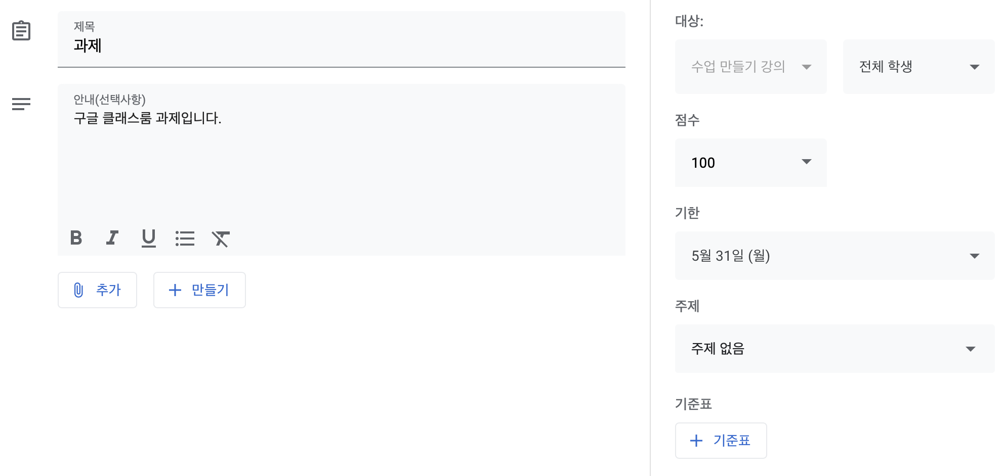 과제 내고 싶으신 계획대로 입력하신 뒤 우측 상단의 '과제 만들기' 버튼을 클릭합니다.