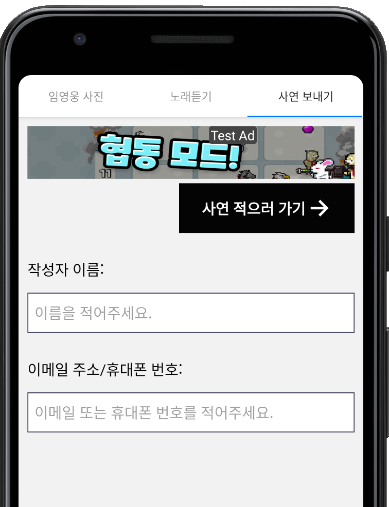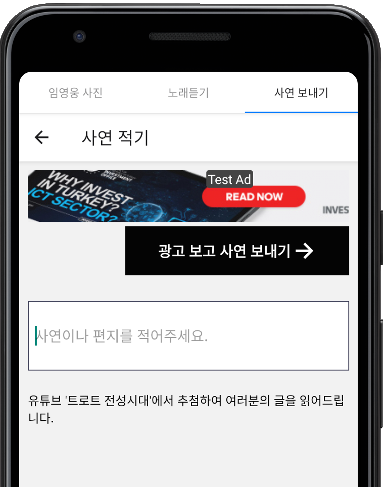 이 곳에 사연을 입력하신 뒤 '광고 보고 사연 보내기' 버튼을 누르시면 됩니다.