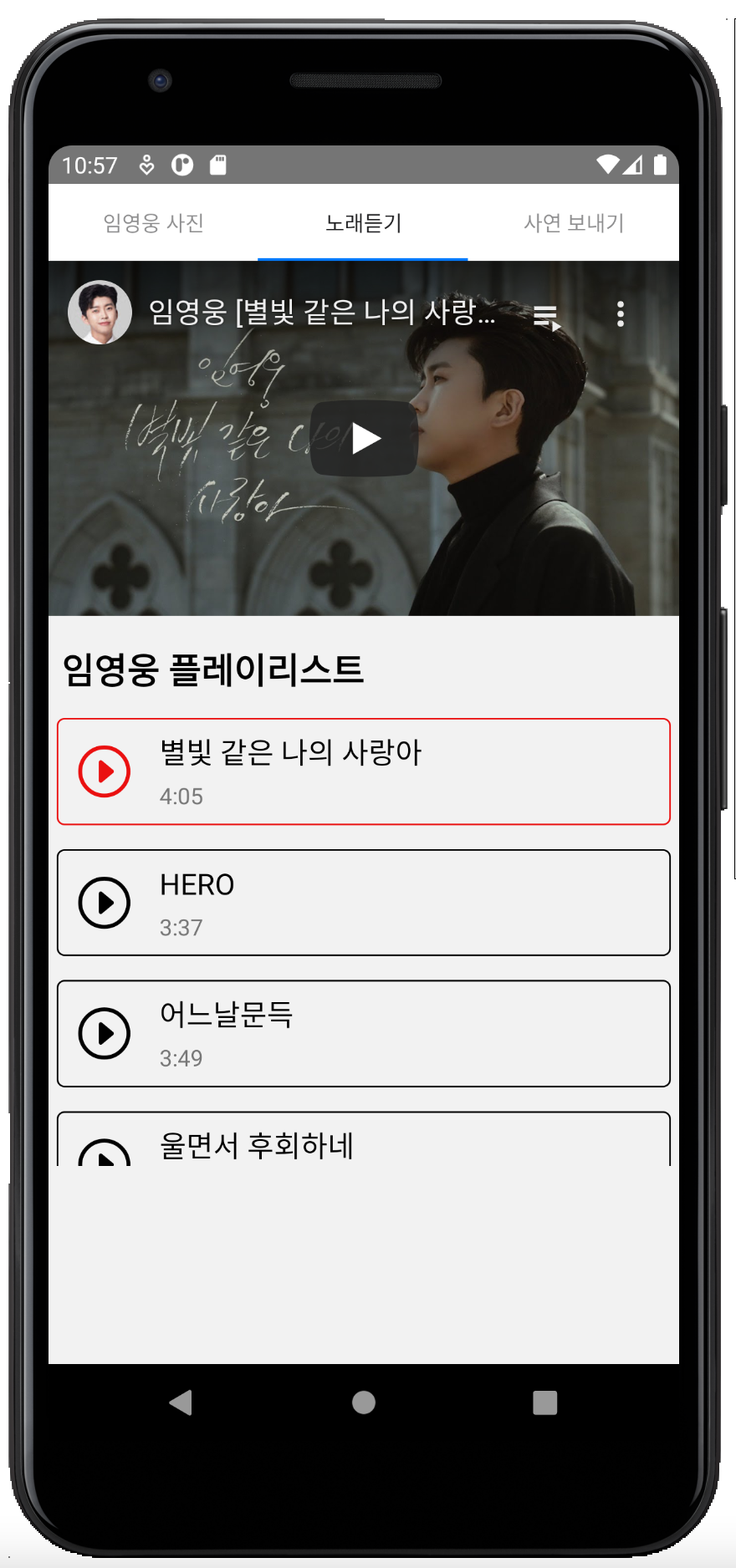 임영웅에게 편지 보내고 싶으신 분! 임영웅 노래모음, 임영웅 무료듣기, 임영웅 무료 사진 어플 찾는 분들을 위한 어플입니다.